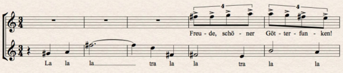 Wenn man nun die Melodien sammelt und untereinander schreibt, sieht man gleich, was hintereinander und was übereinander passt. Manchmal ist allerdings aus harmonischen Gründen eine Zwangspause zwischen der ersten und zweiten Phrasenhälfte einer Melodie vonnöten, deutlich zu hören beim ersten Einsatz von „La donna è mobile“. Dennoch wirkt dieser Arienanfang auch mit einer Pause in der Mitte musikalisch schlüssig - wenn man bereit ist, sich von seinen Hörgewohnheiten zu trennen.