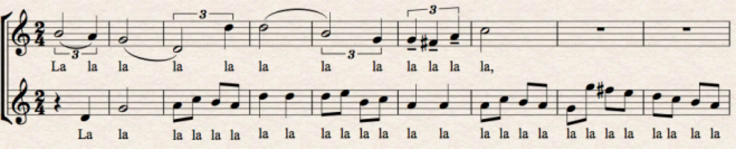 Ich habe aber nicht nur auf Überleitungen verzichtet, sondern die Melodien sogar grundsätzlich sich überlappen lassen, das heißt, der Auftakt zur neuen Melodie erfolgt bereits, bevor die alte zu Ende ist, oder zumindest fällt der Schlusston der einen Melodie mit dem Anfangston der nächsten zusammen. Das war zwar meist schon der Periodik geschuldet, macht zusätzlich aber auch die Komposition dichter.