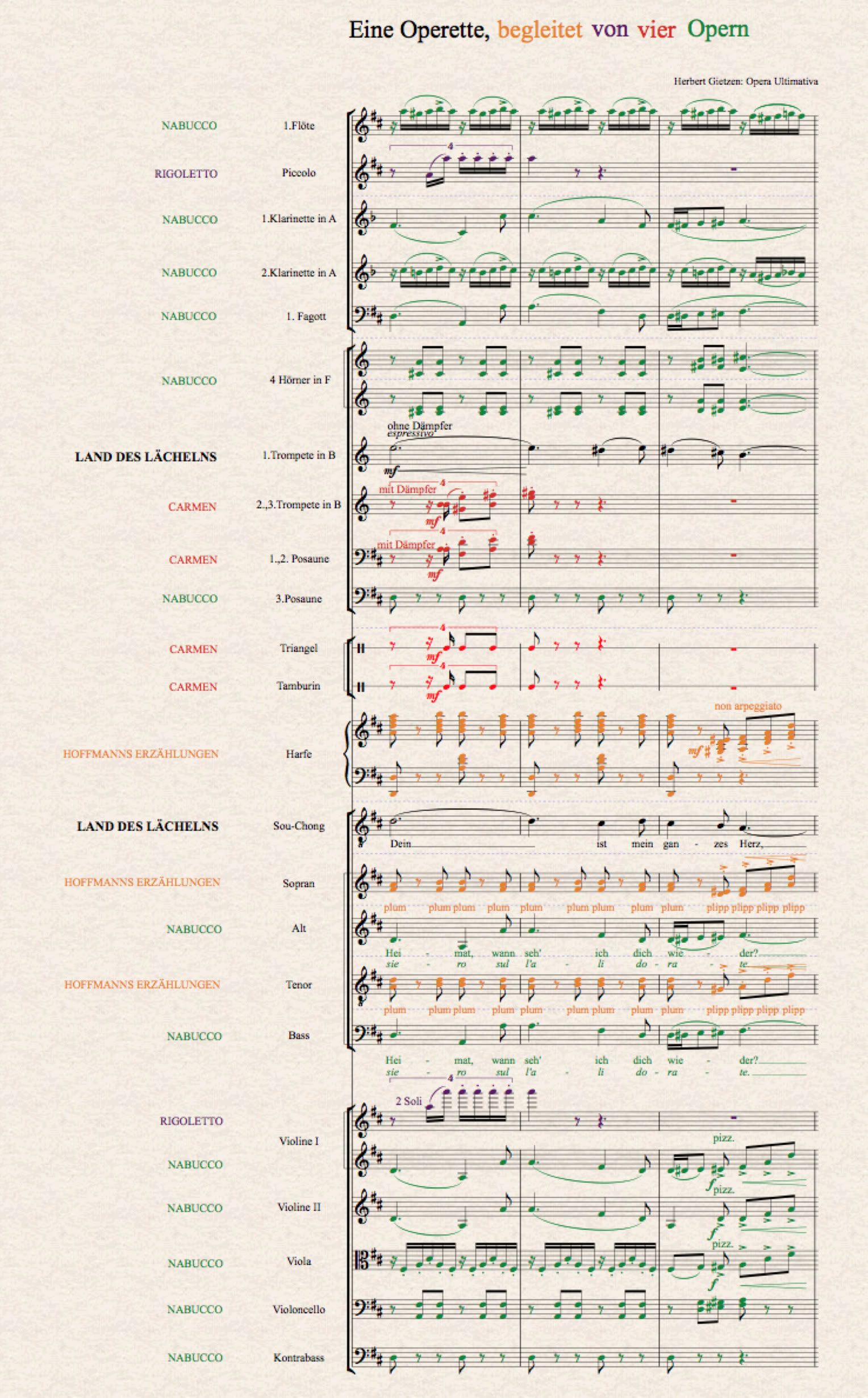 Die größte Häufung gleichzeitig erklingender Melodien und Motive erfolgt zu Beginn von „Dein ist mein ganzes Herz“. Hier wird Sou-Chong begleitet vom Nabucco-Chor mit all seinen originalen Begleitfiguren (Flöte, Hörner, Bratschen), vom Plätschern der Lagunen-Wellen (Harfe, Chor), er wird ferner gleichzeitig von Carmens Hüftschwung aufgereizt (Trompeten, Posaunen) und von Gilda rhythmisch händeringend angefleht (Piccolo, Solo-Violinen). Alles zu sehen in folgendem Notenbeispiel: